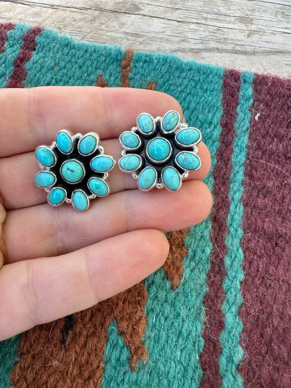 Elegant Handmade Sterling Silver Turquoise Flower Post Earrings. Measuring 1 inch long and wide.