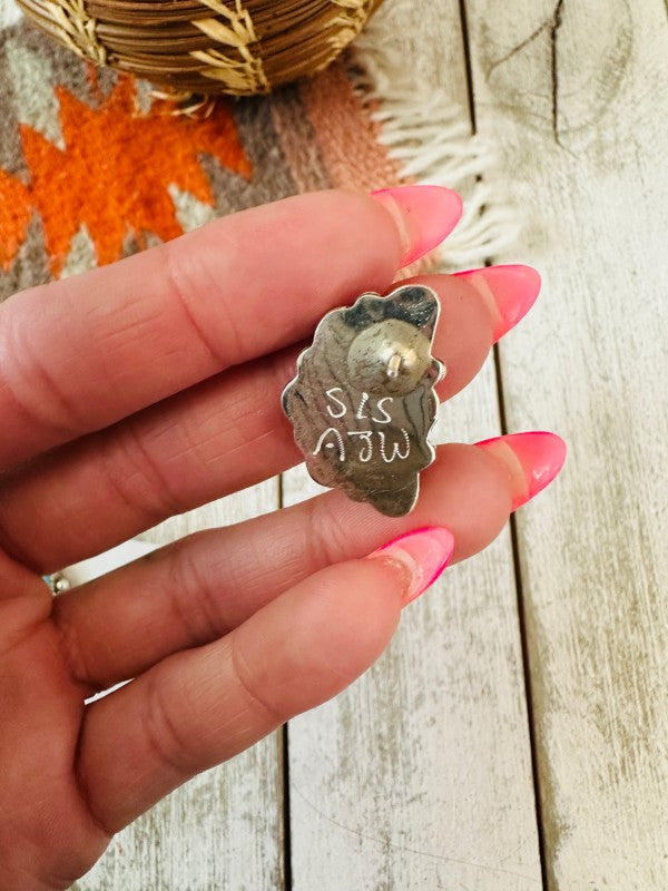 These are a beautiful pair of Navajo Sterling Silver and Green Turquoise cluster post earrings. These measure 1 inch long and 5/8 of an inch wide. Amazing craftsmanship! Signed by the artist and stamped Sterling.