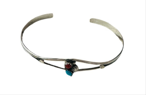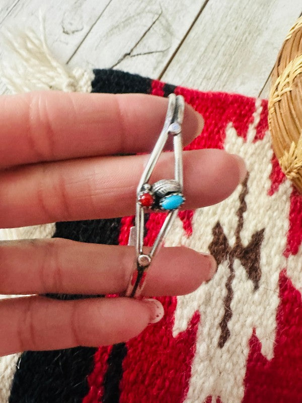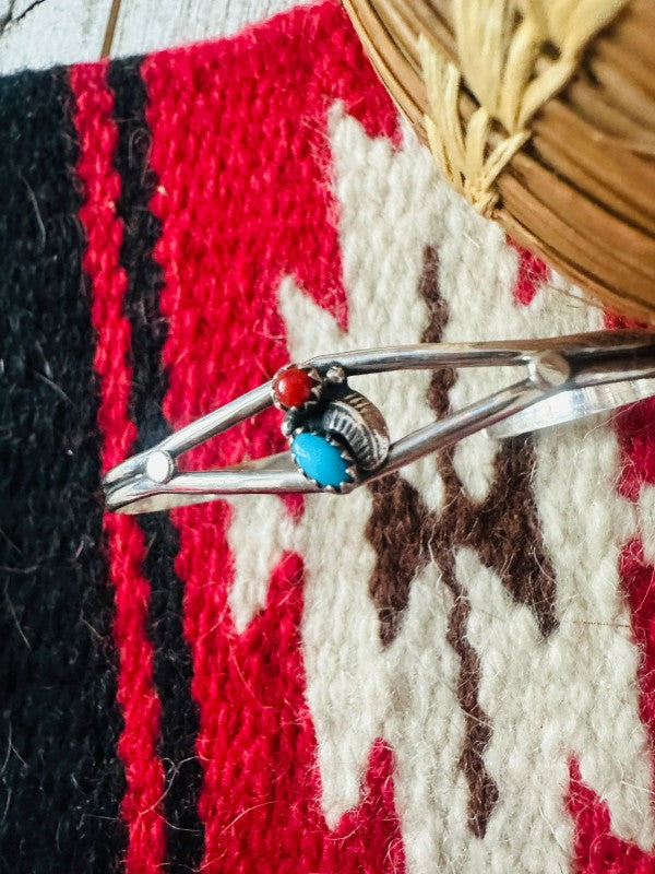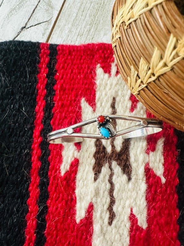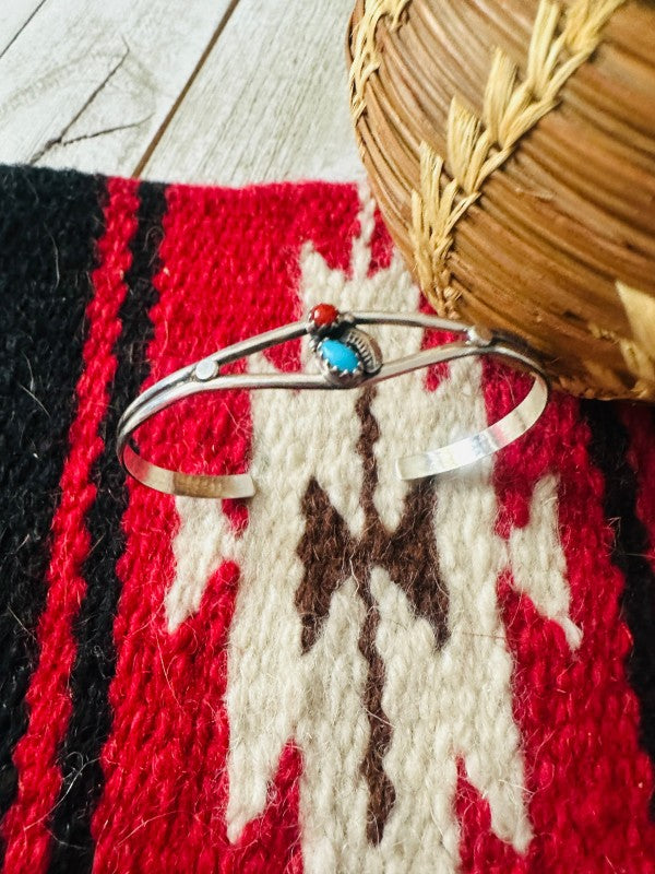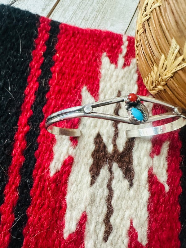 Awesome Navajo Sterling Silver, Turquoise and Coral Cuff Bracelet. Such beautiful craftsmanship! Cuff has an inside circumference of 5 1/4 inches with a 7/8 of an inch gap. Width is 1/2 of an inch.