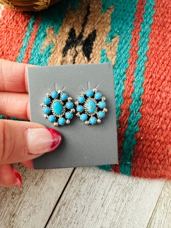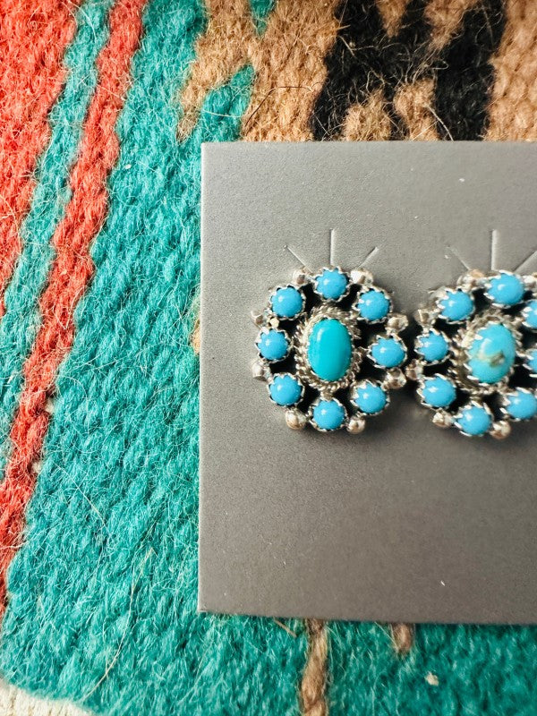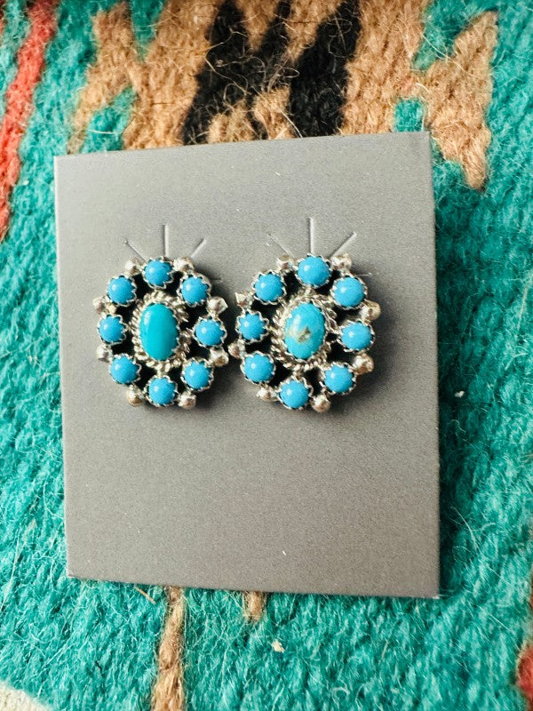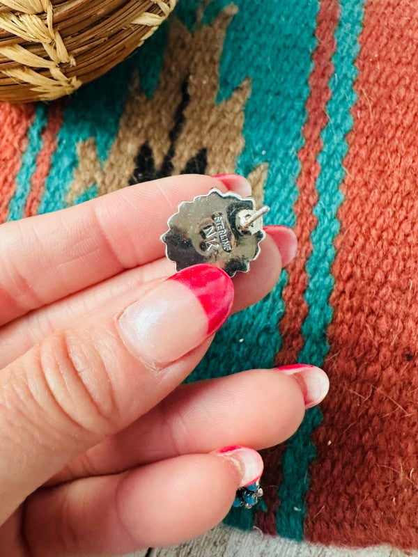 These are a beautiful pair of Navajo Sterling Silver and Turquoise cluster stud earrings. These measure 5/8 of an inch long and 1/2 of an inch wide. Such amazing craftsmanship! Signed by the artist and stamped Sterling. Stones are natural and will vary.