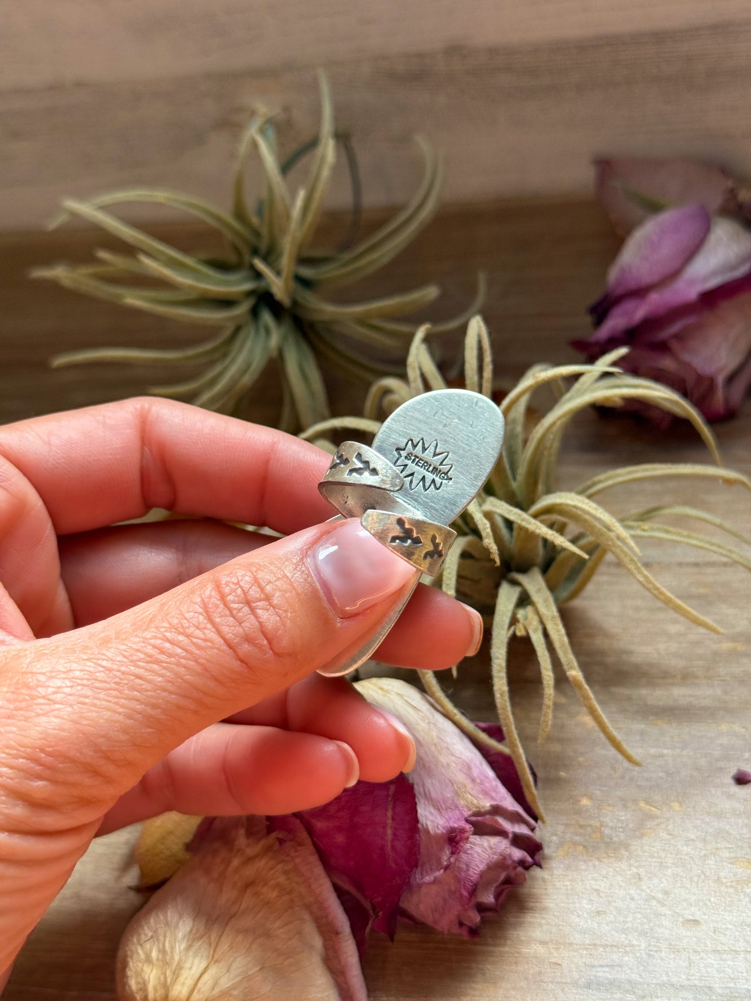 Handmade in New Mexico, USA, this 2-stone Golden Hills turquoise ring captures the rare lilac-blue tones that make this gemstone so distinctive. Set in solid sterling silver, each stone is unique in its matrix and hue, creating a natural harmony of color and texture.