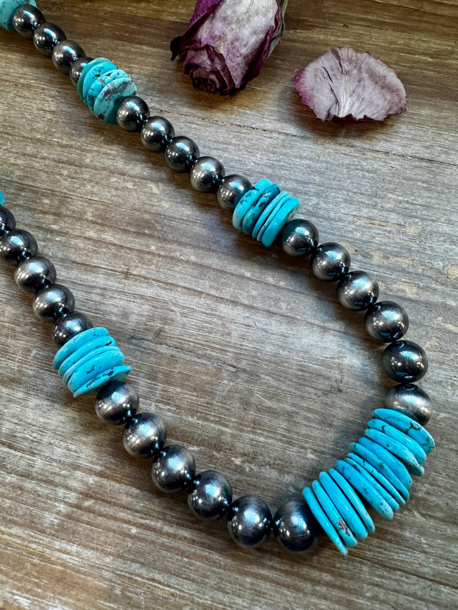 Part of our exclusive NFR Collection, this one-of-a-kind necklace was handmade in the USA. Measuring 35 inches long, it features a stunning combination of 8mm and 14mm sterling silver pearls, finished with a non-tarnish hook for durability. At its center sits a bold 20mm blue turquoise rondelle, adding the perfect Western touch. Only one was made — a true collector’s piece that stands out with its handcrafted detail and high-quality materials.